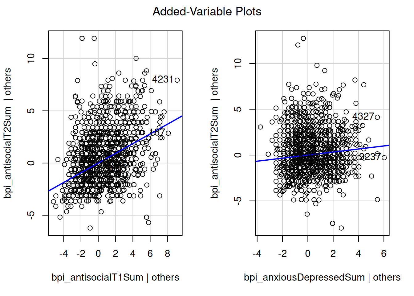 bpi_antisocialT2Sum ~ bpi_antisocialT1Sum + bpi_anxiousDepressedSum,