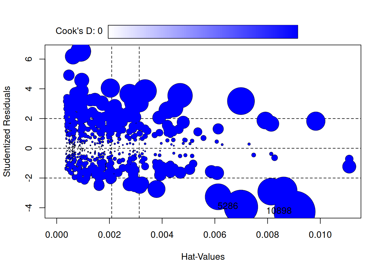 id = TRUE) # circle size is proportional to Cook's Distance