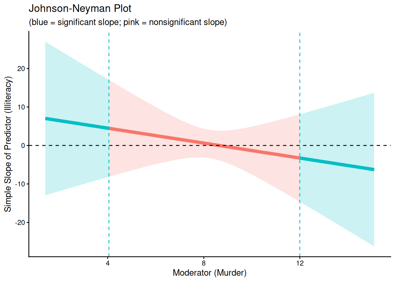 In this particular model, the predictor (`Illiteracy`) is not significant at any of the levels of the moderator (`Murder`), because the 95% confidence intervals of all simple slopes include zero, in this case, likely due to a small sample size ($N = 50$) and the resulting low power.